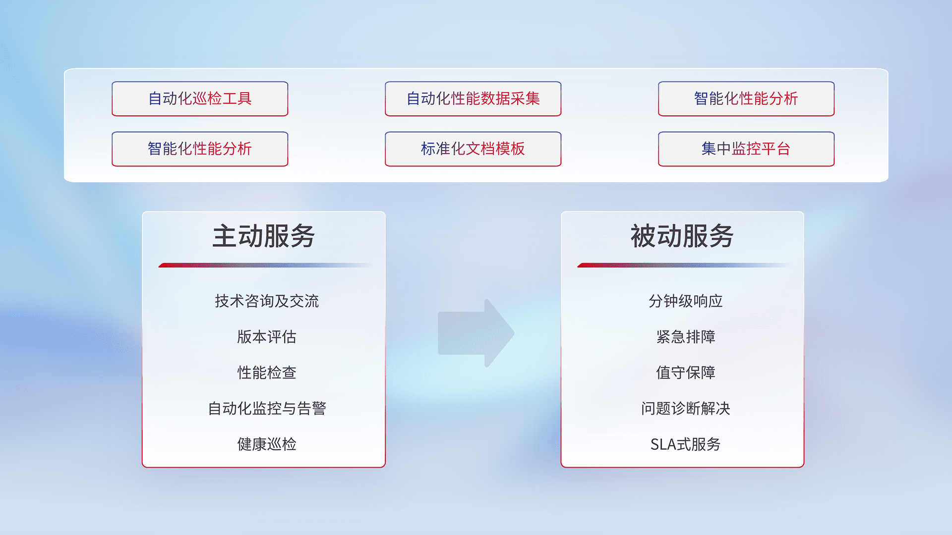 智能化工具和标准化文档,,保障服务质量,,提供主动服务(包含技术咨询、、版本评估、、、性能检查、、自动化监控与告警、、、、健康巡检)和被动服务包含(分钟级响应、、紧急排障、、值守保障、、、、问题诊断解决、、、SLA服务)。。